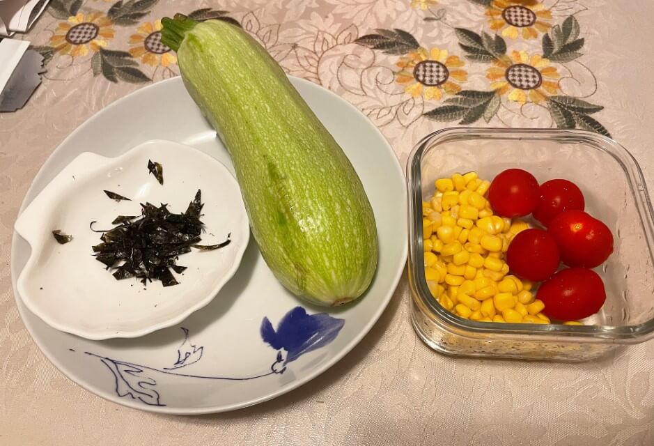5. 將粟米粒、車厘茄和紫菜碎放在瓜麪上。